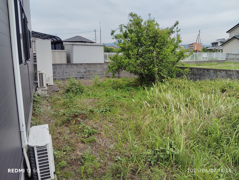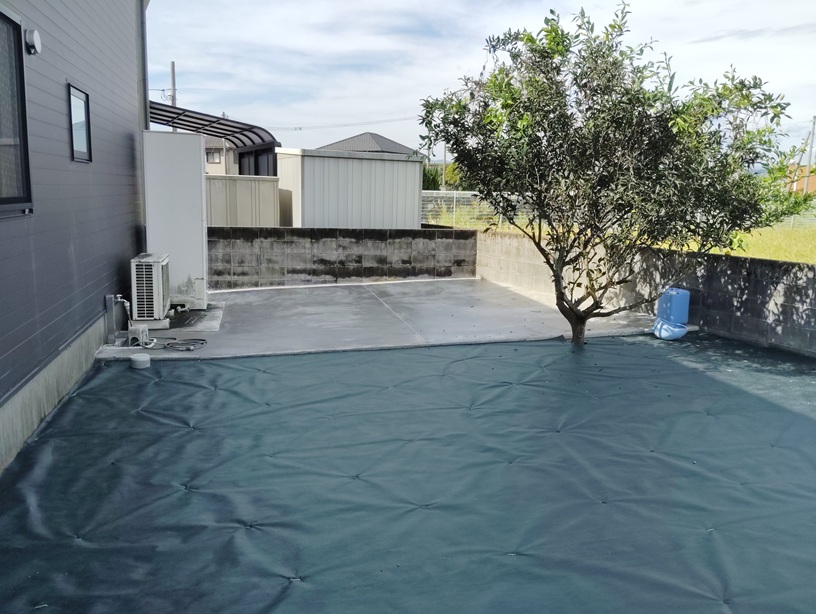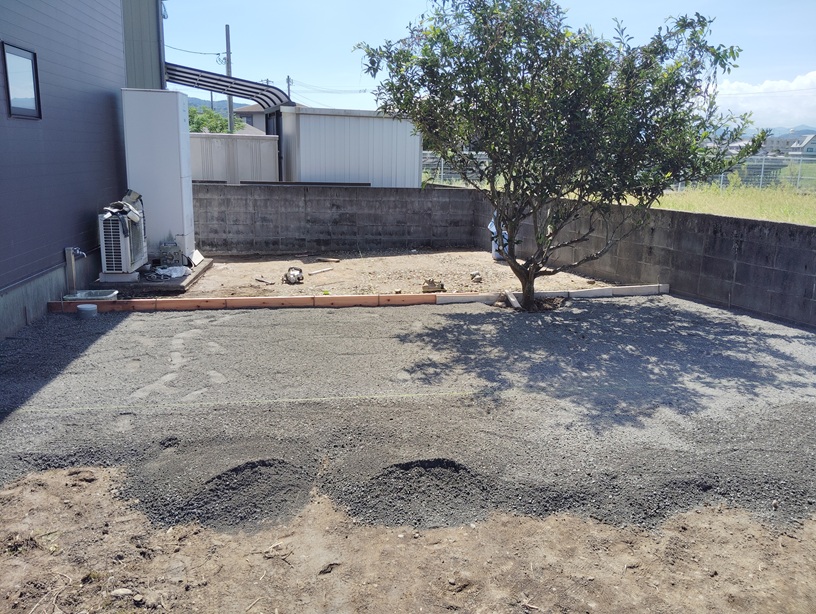 今回ご相談いただいた場所は、もともと家庭菜園として使われていたスペースでした。 本格的な畑というより、日常の中で楽しむ程度のものでしたが、草が伸びるたびに草刈りが必要で、その作業が次第に大きな負担になっていったそうです。 年齢を重ねるにつれて、以前のようにこまめな草刈りが難しくなり、 「やらないといけない」と思いながらも手がつけられない状態が続いていました。 さらに犬を飼い始めたことも、一つの大きなきっかけでした。 草が伸びたままの状態や土のままの地面では、足元が不安定で使いにくく、 ワンちゃんの散歩やちょっとした運動不足の解消を考えると、安心して使える空間にしたいという思いが家族の中でも強くなってきたことで今回の工事に至ったようです。